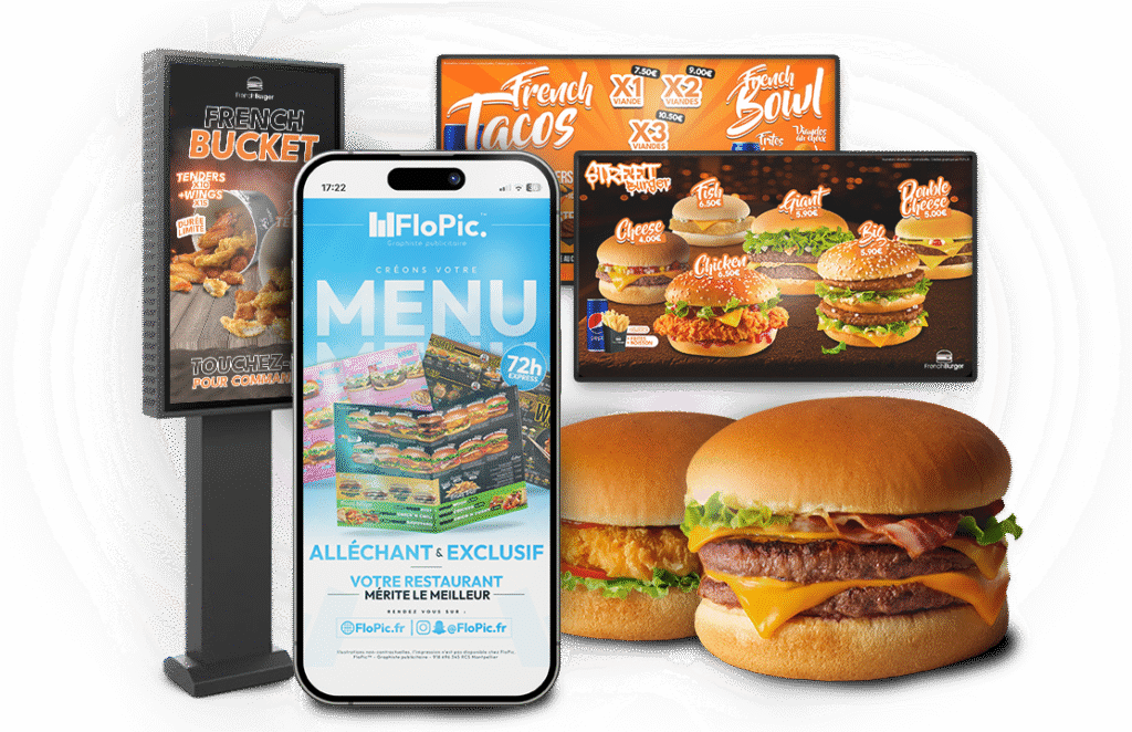 Création de visuels produits sur-mesure, menus board vidéos/physiques, écrans de veille de bornes…